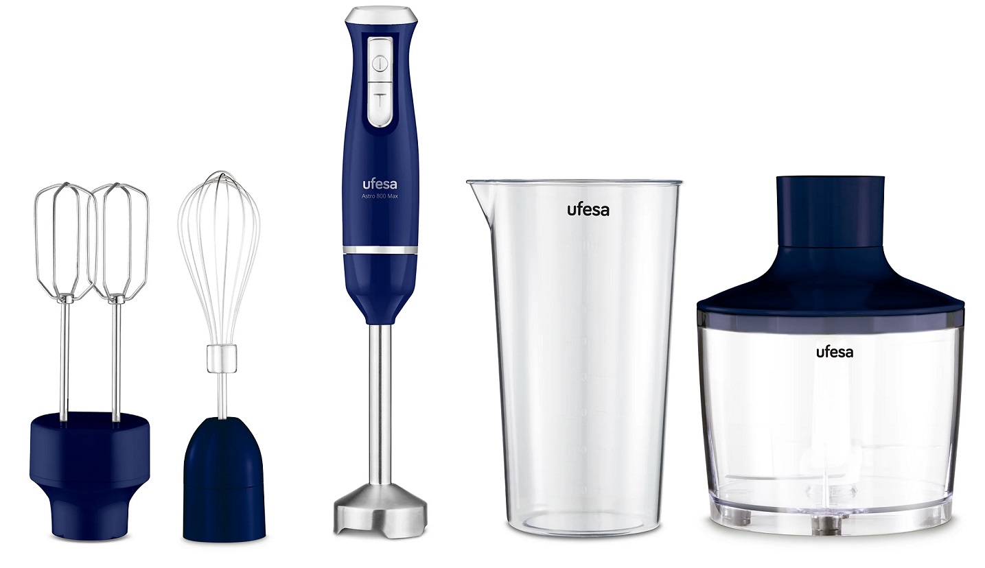 BATIDORA UFESA C.M. 800W AZUL + PICADORA+MONTACLARAS FUNCIÓN TURBO 4 CUCHILLAS DE ALTA EFICIENCIA ERGONÓMICA DISEÑO ANTI SALPICADURAS VASO MEDIDOR DE 600ML LIBRE DE BPA ACCESORIO PICADORA LIBRE DE BPA BATIDOR EMULSIONADOR 600 W