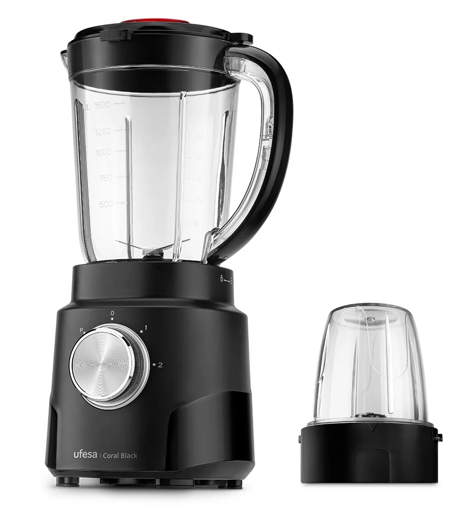 BATIDORA UFESA VASO 1,5L 600W NEGRA JARRA DE TAPA CON CIERRE HERMÉTICO CON APERTURA PARA INTRODUCIR ALIMENTOS 2 VELOCIDADES + TURBO 4 CUCHILLAS EXTRAÍBLES DE ACERO INOXIDABLE BLOQUEO DE SEGURIDAD JARRA APTA PARA LAVAVAJILLAS PIES ANTIDESLIZANTES PROTE