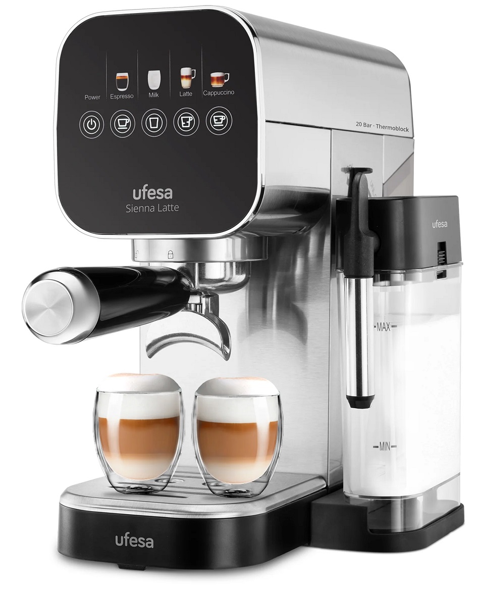 CAFETERA UFESA EXPRESS 20 BARES SIENNA LATTE JARRA LECHE Sistema de calentamiento instantáneoThermoblock Portafiltro metálico para 1 y 2 tazas PANEL TACTIL