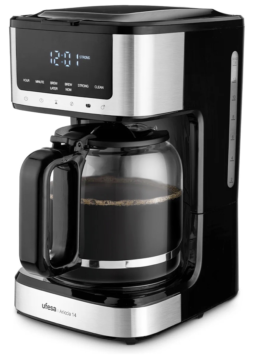 CAFETERA UFESA GOTEO 900 W CAPACIDAD: 14 TAZAS DE CAFÉ, 1,8L PANTALLA TÁCTIL CUERPO DE ACERO INOXIDABLE PREPARACIÓN PROGRAMABLE EMBUDO EXTRAÍBLE VERTICALMENTE CON FILTRO DE NYLON. PROTECCIÓN ANTIEBULLICIÓN. JARRA DE CRISTAL Y EMBUDO APTOS PARA LAVAVAJILLA